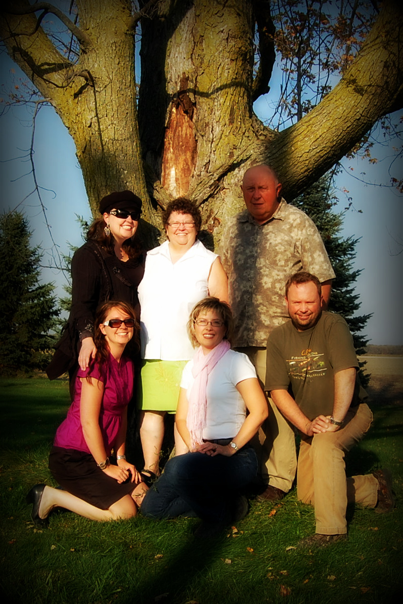I can remember sitting under it with a book, waiting for the bus and collecting beautiful coloured leaves from under it in the fall.When my family gathered at Thanksgiving this year, we were told the tree had to be cut down. It was dead for the most part and this year while other trees flaunted their fall colours, this tree looked rather barren. My brother John suggested we get some photos with the tree as the next time we gather as a family, it will be gone.